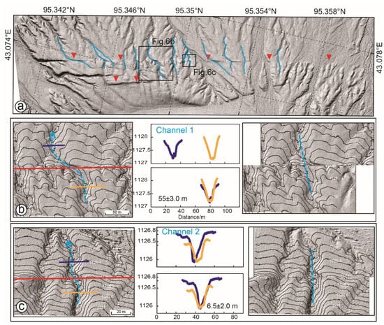 Displaced geomorphic features of the fault at Site 3. (a) SfM-derived hillshade image. Red triangles show the fault trace on the alluvial fan surface. (b) SfM-derived contour map of Channel 1 and realignment of the horizontal displacement. (c) SfM-derived contour map of Channel 2 and realignment of the horizontal displacement. The red line represents the fault trace. Yellow and blue lines represent toporaphic profile of channel for offset measurement.