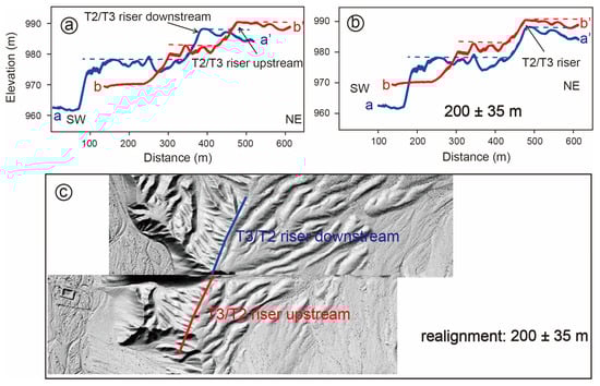 Reconstructions of the displacement of the T2/T3 riser on the eastern bank of the Xiamaya River. (a) Original topographic profile of cross-sections of the river; (b) Realignment of topographic profile of cross-sections of the river; (c) Realignment of T2/T3 riser. The red and blue line representthe upstream and downstream cross-sections of the river, respectively.