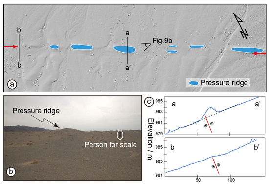 (a) Shaded relief map of Site 3 showing a series of bulges along the fault trace which are interpretated as pressure ridges related to left-lateral slip motion. (b) Field photo of a pressure ridge in the field. (c) Topographic profile perpendicular to the fault trace. The a-a’ profile across a ridge shows a height of nearly 2 m, while the b-b’ profile shows negligible vertical displacement. The locations of the profiles can be seen in (a).