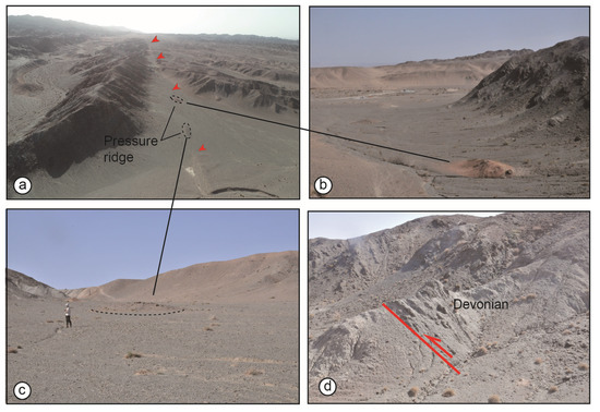 On the alluvial fan surface of the east Xiamaya River, multiple pressure ridges aligned with the fault strike were observed (Figure 9a,b). These ridge structures run nearly parallel to the fault, extending tens of meters in length, with a maximum height of 1.5 m (Figure 9c). Compressional folding typically develops along restraining bends of strike-slip faults, manifesting morphologically as uplifted ridges or pressure ridges. We therefore interpret these bulges as pressure ridges related to strike-slip motion. Similarly, the fault also displaces small alluvial fans on the western bank, forming prominent mole tracks in the alluvial deposits (Figure 10a–c). On the western bank of the Xiamaya River, the fault extends through bedrock mountains, where Devonian dark-gray tuffaceous sandstone thrusts southward over Carboniferous sandstone (Figure 10d). The fault zone exhibits pronounced brecciation, and the Devonian tuffaceous sandstone displays distinct foliation structures with bedding attitudes of 170°∠53°. The consistent orientation between bedding planes and fault planes suggests the fault underwent ductile deformation before being exhumed through subsequent brittle deformation.