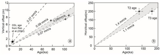 The slip rate is a crucial parameter in the quantitative study of active faults, as it not only reflects the intensity of faulting, but can also be directly applied to probabilistic seismic hazard assessments of the fault [63,64,65]. To derive the vertical slip rate along the Yanchi segment of the NKTF, we plotted the vertical offsets derived from scarp profiles on the A2 fan surface against the corresponding exposed 10Be ages at Site 2 (Figure 7).