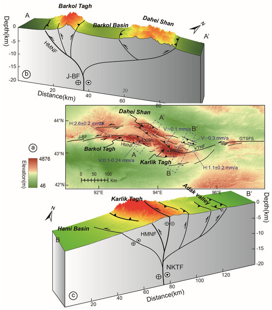 (a) Distribution of active faults on easternmost Tian Shan; (b) Possible block 3D model across the Barkol across the Barkol Tagh; (c) Possible block 3D model across the Barkol across the Karlik Tagh. The 3D profiles A–A’ and B-B’ are extracted from DEM. The geological cross-section underground and the linkage of faults at depth are modified from [22]. HMNF-Hami Basin North Fault; KTNF–Karlik Tagh North Fault; GBTSFS–Gobi-Tian Shan Fault Systems; J-BF–Jianquanzarkol Fault.