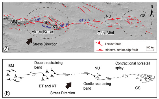 A previous study thinks that the Barkol Tagh and Karlik Tagh ranges form the western horsetail termination of the GTSFS [22]. In terms of planar geometry, the western segment of the J-BF and the eastern segment of the NKTF are arranged in a sinistral right-step pattern, forming a rhombic compressional stepover zone between the two strike-slip fault branches. This stepover zone encompasses Barkol Tagh and Karlik Tagh, with an approximate 100 km length in the E-W direction and 90 km wide in the N-S direction, within which a series of NW-trending thrust faults or folds have developed (Figure 16a). The spatial relationship between the active faults and the topography suggests strongly that Barkol Tagh and Karlik Tagh are large double left-lateral restraining bend ranges between the J-BF and NKTF or GTSFS (Figure 16b).