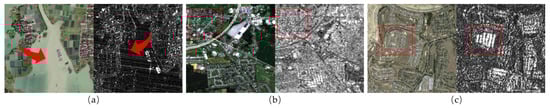 Nevertheless, achieving accurate optical–SAR registration remains a challenging task due to substantial differences in imaging mechanisms, geometric structures, and radiometric properties. These disparities result in non-linear intensity differences, geometric distortions, and the presence of speckle noise in SAR images, which collectively hinder reliable matching [7]. Figure 1 illustrates three representative optical–SAR image pairs from diverse landscapes and resolutions, clearly showing their significant discrepancies in texture, edge definition, and radiometric patterns. Figure 1a shows the considerable radiometric discrepancy in water regions between optical and SAR modalities; Figure 1b highlights the inconsistent texture patterns in urban areas; and Figure 1c illustrates the structural blurring caused by speckle noise, which is prevalent in SAR images. These discrepancies substantially increase the difficulty of accurate registration across modalities.