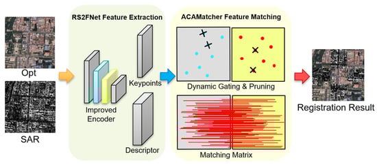 Remote sensing image registration serves as a fundamental prerequisite for advanced applications such as multi-source data fusion, change detection, and object recognition. It is particularly critical in scenarios such as natural resource surveys, environmental monitoring, meteorological forecasting, homeland security, and disaster response [1]. With the rapid development of various remote sensing platforms—especially optical and SAR sensors—multimodal image processing has become a growing trend in remote sensing analysis. Optical imagery, due to its high visual fidelity and alignment with human perception, has been extensively used for surface interpretation and object identification [2]. However, it is often hindered by adverse weather conditions, such as cloud cover, which limits its usability during rainy or cloudy seasons. In contrast, SAR imagery, which relies on active microwave emission, is capable of penetrating clouds and vegetation to capture stable surface observations under all-weather and all-day conditions [3]. Given their complementary characteristics, the joint use of optical and SAR images can provide a more comprehensive and robust understanding of the Earth’s surface, offering significant advantages in tasks such as image fusion [4], change detection [5], and land cover classification [6]. High-precision registration between optical and SAR images is thus crucial for effective multi-source data integration.