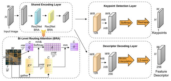 The keypoint detection branch takes as input the output from the Shared Encoding Layer, which has a resolution of . A 1 × 1 convolution reduces the channel dimension to 65, where 64 channels correspond to specific grid locations within an 8 × 8 window, and the 65th channel represents background or non-keypoint regions. A softmax activation function is then applied for spatial normalization, and the resulting tensor is reshaped back to the original resolution , producing a probability map that reflects the likelihood of each pixel being a keypoint.