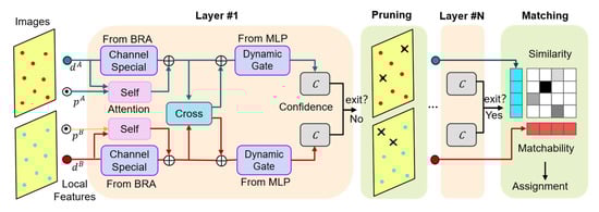 Overall architecture of ACAMatcher. It comprises two main components: a bidirectional attention module that integrates self- and cross-attention guided by BRA features, and a dynamic pruning module that predicts confidence via gated fusion for sparse and reliable matching.
