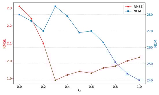 As shown in Figure 13, RMSE decreases and NCM increases as λ6 grows from 0 to 0.3, peaking at λ6 = 0.3, and then slightly degrading. Thus, a moderate λ6 best balances precision and generalization.