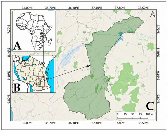 The NNP is a UNESCO World Heritage Site, located between 7.75°–10.5°S and 36.0°–38.7°E [18]. It is the largest national park in Africa [17,29], covering an area of 30,893 km2 (Figure 1). The park was established in 2019, and incorporated within its boundaries is a region that formerly belonged to the Selous Game Reserve, with the following upgrade in conservation status, affecting both consumptive and non-consumptive uses [30,31].
