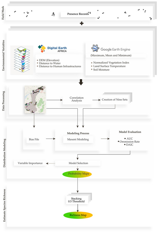 This study has three objectives: (i) to model the spatial distribution of selected mammal species using SDMs and remote sensing-derived environmental variables; (ii) to identify key environmental factors shaping species distributions at a local scale; and (iii) to estimate mammalian species richness through an SDM framework. By achieving these aims, this study provides essential ecological baselines to inform targeted conservation planning and support sustainable ecotourism development in Southern Tanzania, in line with national biodiversity strategies and economic diversification priorities [28].