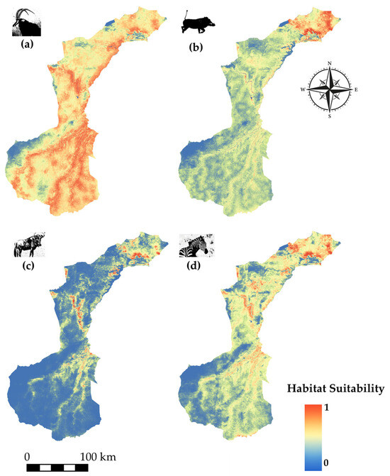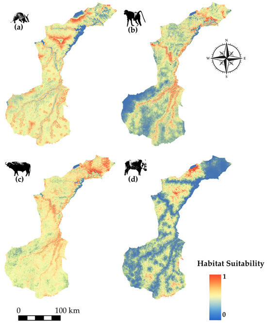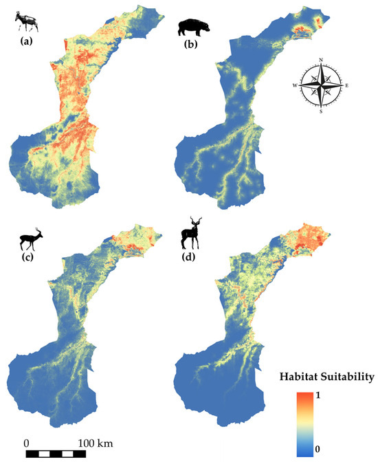 Species modeled spatial distribution for (a) sable antelope (Hippotragus niger), (b) common warthog (Phacochoerus africanus), (c) wildebeest (Connochaetes taurinus), and (d) zebra (Equus quagga).