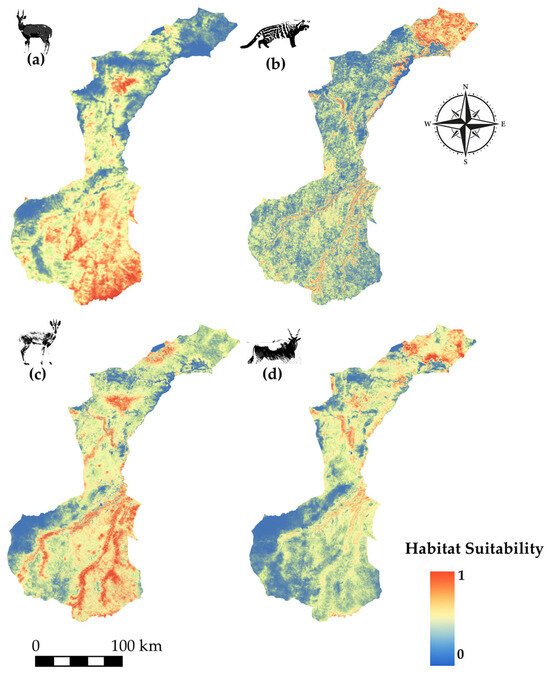 Figure 4, Figure 5, Figure 6, Figure 7 and Figure 8 present the modeled spatial distribution of all species, expressed in terms of habitat suitability, ranging from 0 (completely unsuitable) to 1 (completely suitable).