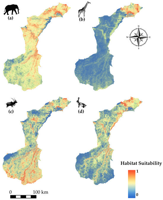 Species modeled spatial distribution for (a) African elephant (Loxodonta africana), (b) giraffe (Giraffa camelopardalis tippelskirchi), (c) greater kudu (Tragelaphus strepsiceros), and (d) African savanna hare (Lepus victoriae).