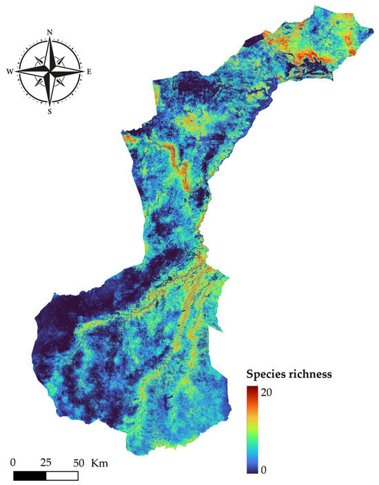 Figure 9 represents the modeled species richness across NNP. It was produced by stacking the continuous habitat suitability maps, resulting in a composite where higher values indicate areas predicted to be suitable for a greater number of species. This spatial overlay reveals clear geographic gradients in mammalian richness within NNP.