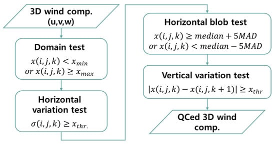 A flowchart of the quality control procedure for 3D wind components. The arrows indicate the sequential steps in the QC process. The variable x is a proxy for the wind components (u, v, w) and their respective thresholds. The parameter σ denotes the local standard deviation within a 5 × 5 grid window used for the horizontal variation test. The indices i, j, k represent the longitude, latitude, and vertical levels, respectively.