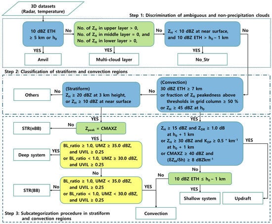 To overcome these limitations, several classification schemes using three-dimensional (3D) radar observations have been proposed [1,13,14]. Feng et al. [13] developed a hybrid classification algorithm (HCA) that combines 3D radar reflectivity with GOES satellite products, including infrared brightness temperature and retrieved cloud top and base heights. However, this method relies on the availability of both radar and satellite data and is affected by smoothing artifacts resulting from horizontal resolution merging. Starzec et al. [1] introduced the Storm Labeling in Three Dimensions (SLTD) approach using dual-polarization radar to effectively identify updraft regions based on thresholds of ZH, ZDR, and KDP. Dixon and Romatschke [14] proposed the Echo Classification from Convectivity (ECCO) algorithm, which uses reflectivity texture and convectivity from 3D radar networks and temperature fields. Despite such advances, accurately distinguishing deep stratiform systems remains a challenge.