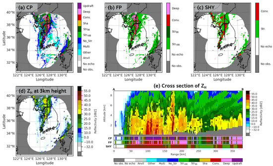 Precipitation classification and reflectivity features of a heavy rainfall event associated with the Changma front observed at 08:00 UTC on 29 June 2019. (Top) Precipitation types identified by (a) CP, (b) FP, and (c) SHY algorithms. (Bottom) (d) 3D CAPPI reflectivity at 3 km altitude and (e) vertical cross-section of reflectivity (ZH) along the A–B line shown in panels (a–d).