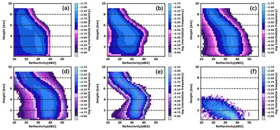 The CFADs of radar variables for (a) StrnBB, (b) StrBB, (c) convection, (d) updraft, (e) deep system, and (f) shallow system, using rain cases during warm seasons. The colors indicate the log-normalized frequencies.