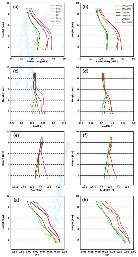 Mean vertical profiles of dual-polarization radar variables for different precipitation types. Panels (a–d) on the left show profiles of ZH, ZDR, KDP, and ρHV, respectively, for the CP classification. Panels (e–h) on the right show the corresponding profiles for the FP (solid lines) and SHY (dashed lines) classifications. The color lines represent precipitation types: stratiform without a bright band (lime green), stratiform with a bright band (dark green), convection (red), updarft (purple), deep systems (brown), and shallow systems (orange).