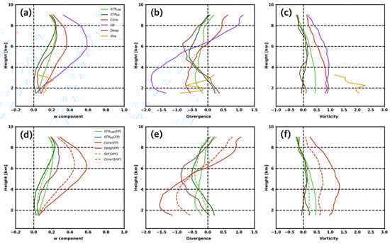 Mean vertical profiles of dynamical variables derived from WISSDOM for different precipitation types. Panels (a–c) show profiles of the vertical wind component (w), divergence, and vorticity, respectively, for the CP classification. Panels (d–f) display the corresponding profiles for the FP (solid lines) and SHY (dashed lines) classifications. The color lines indicate the precipitation types, which follow the same color scheme as in Figure 8.