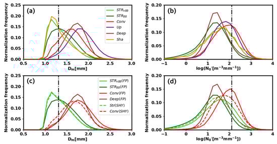 Probability density functions (PDFs) of microphysical variables for different precipitation types. Panels (a,b) show the PDFs of mass-weighted mean diameter (Dm) and normalized intercept parameter (logN0′), respectively, for the CP classification. Panels (c,d) present the corresponding distributions for the FP (solid lines) and SHY (dashed lines) classifications. The color lines indicate the precipitation types, following the same color scheme as in Figure 8. Dashed black lines represent the mean values derived from the 2 DVD dataset.