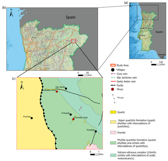 Freixeda is located in Zona de Galiza-Trás-os-Montes (ZGTM) in the municipality of Mirandela, north of Portugal (Figure 1). The study area has 83 km2 of extension and encompasses several mineralizations of Au-Ag (silver)-As (arsenic) and As-Au-Ag with some mining activity from the Roman period [25,26]. The Freixeda Philonian field is also rich in tungsten, lead, zinc, and copper. Antimony can be found in small quantities and is always associated with gold deposits [27]. Among these mineralizations, we can give the example of the Freixeda mine, which encompasses two important veins (São Jerónimo and Santo André veins) with Sb mineralization [27]. The Covo vein is northeast of the Freixeda mine, a continuation of the São Jeronimo lode and, therefore, has great potential for Sb mineralization [27].