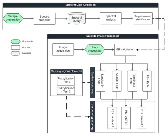 The step-by-step process illustrated in Figure 2 outlines the methodology used in this study. It can be divided into two main stages. The first stage, spectral data acquisition, involves collecting spectral data from rock samples, organizing it into a spectral library, and analyzing it to identify target minerals. The second stage, satellite image processing, focuses on calculating specific BRs to map target minerals, identify potential areas of interest, and compare the results obtained from the PS sensor with other satellites. This comparison helps assess the degree of similarity between datasets and evaluate the PS sensor’s ability to detect iron oxides.