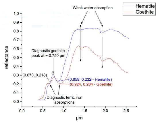 Concerning the Goethite spectrum (Figure 3), two diagnostic iron absorption features (at ~673 nm and ~924 nm) and one diagnostic reflectance peak at ~750 nm can be observed [43]. After that, in the SWIR region, we can observe two generic OH/water absorption features at ~1401 nm and ~1915 nm. Hematite differs from Goethite by a tiny difference in one of the iron absorption bands that appears at ~859 nm [44,45].