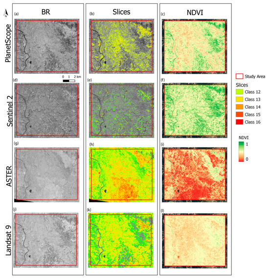 Spatial distribution of pixels classified between classes 12 and 16, derived from band ratio (BR) analyses using PS, Sentinel-2, ASTER, and Landsat 9 imagery. These classes represent increasing probabilities of Fe3+ presence, with warmer colors indicating higher values. Subfigures illustrate the BR results and their corresponding color slice visualizations for each satellite: (a–c) BR map, color slice of BR, and NDVI for PS; (d–f) BR map, color slice of BR, and NDVI for Sentinel 2; (g–i) BR map, color slice of BR, and NDVI for ASTER; (j–l); BR map, color slice of BR, and NDVI for Landsat 9.