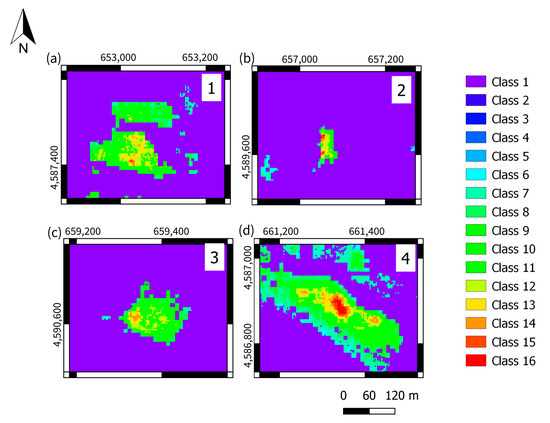 For example, in ROI 3 (Figure 5a), there is a concentration of high-value pixels (classes 15 and 16) in the southwestern corner of the ROI. In ROI 4 (Figure 5d), the high-value pixels (classes 15 and 16) are concentrated in the center of the ROI. The clusters observed in Figure 5 allow the field validation team to directly target locations with a higher probability of iron oxide occurrences.