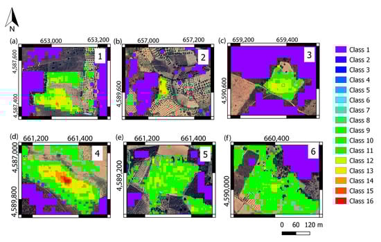 Conversely, Test 2 identified ROIs 1 (Figure 6a), 2 (Figure 6b), 3 (Figure 6c), and 5 (Figure 6e), with clusters predominantly composed of class 12 and 13 pixels, which hinders a more direct approach and requires a broader area to be analyzed for field validation compared to Test 1. However, Test 2 yielded good results for ROI 4 (Figure 6d).