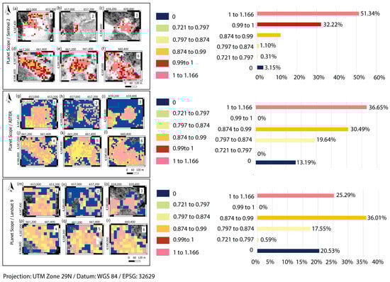 When analyzing only the areas of interest, a stronger relationship emerges between the level of result correspondence and the spatial resolution of the satellites. The data suggest that as spatial resolution decreases, non-correspondence increases. Sentinel-2 (10 m) shows the highest agreement with PS (3 m), followed by ASTER (15 m), and finally, Landsat 9 (30 m), which has the lowest correspondence. This confirms that the further a satellite’s spatial resolution deviates from PS, the more different the results become due to increased pixel aggregation and spectral mixing.
