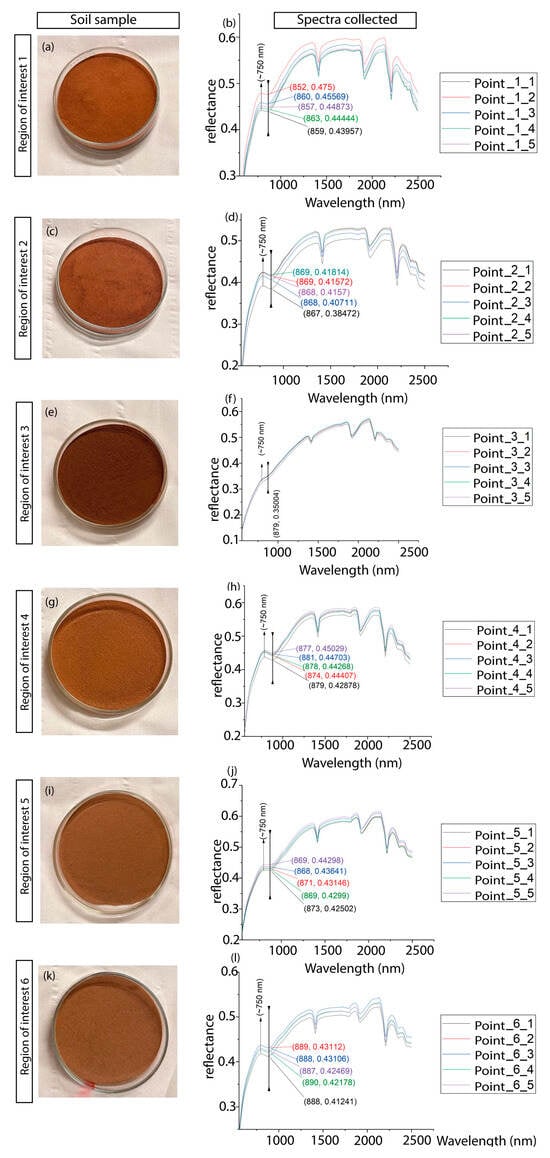 All spectra display a reflectance peak at approximately 750 nm. This peak is slightly weaker in the sample from ROI 5 (Figure 9i,j) and significantly weaker in the sample from point 3 (Figure 9e,f). Given that Hematite typically exhibits a reflectance peak at 750 nm and Goethite around 660 nm, and that all spectra display a peak at 750 nm, the results suggest that Goethite is absent in the analyzed soil samples, with Hematite being the predominant iron oxide identified.