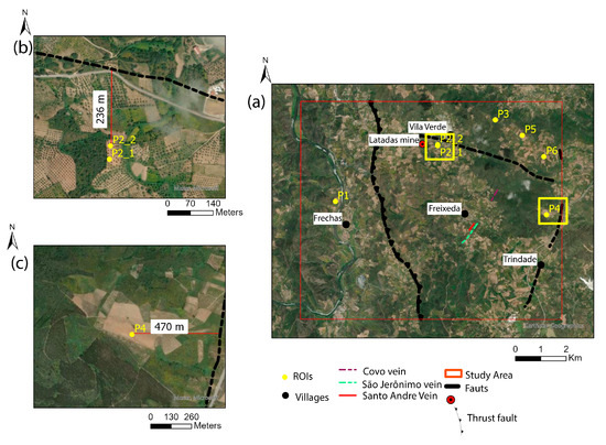 ROI’s location in the study area. Freixeda mine is highlighted by a red triangle and the orange triangle highlights the Covo location.