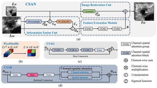 Overall network structure of our proposed CSAN. (a) The architecture of CSAN, which consists of three parts: the information fusion unit, the feature extraction module, and the image restoration unit. represents the set of LR input bands, is the HR input, and is the super-resolved output. For the model, includes three 1 km bands and is the original 0.5 km band. For the model, includes twelve 2 km bands and combines the original 0.5 km band and the super-resolved 1 km bands. (b) Schematic diagram of the PixelShuffle module, which converts the channel dimension into the spatial dimension. (c) Illustration of the CSAG module, which includes five CSABs and a convolutional layer. (d) Illustration of the CSAB module containing the channel–spatial attention mechanism.