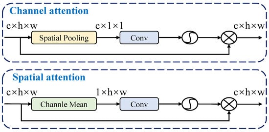 Let denote the input feature map with c channels and spatial size . In the channel attention module, I is subjected to a global average pooling operation that reduces its spatial dimensions to , followed by a convolutional layer . We then utilize a sigmoid function to introduce the gating mechanism, and the resulting channel weights are multiplied by I channel-wise to yield the rescaled output , which highlights the salient channel features. The entire process is formulated as