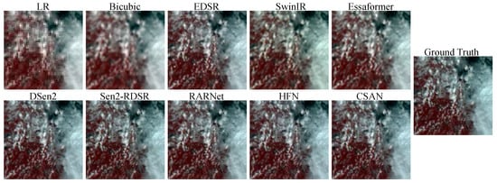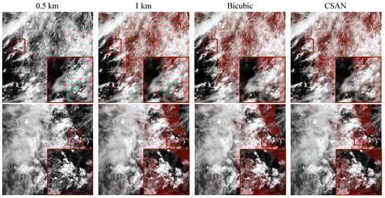 For the SR, we select three 1 km bands (vi008, vi005, vi004) and compose them into a false color composite image for visual comparison, as shown in Figure 7. Compared to Bicubic, which produces noticeably blurry outputs and fails to recover fine-grained details, CSAN generates visually sharper and more structured images. The CSAN results closely approximate the visual quality of the reference 0.5 km band.
