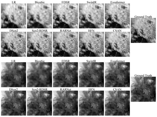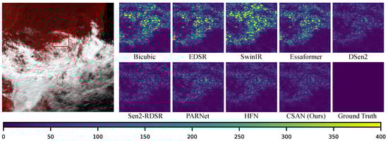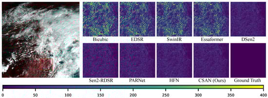Table 8 and Table 9 present the complexity comparison of all evaluated methods in terms of the number of parameters, training time, and inference time. All methods were executed on a single NVIDIA GeForce GTX 2080 Ti GPU. The inference time is defined as the total time required to super-resolve all testing regions. Among these methods, CSAN has fewer parameters than Essaformer, SwinIR, EDSR, HFN, Sen2-RDSR, and DSen2, yet it achieves better results, demonstrating an advantageous trade-off between performance and model size. Furthermore, CSAN efficiently super-resolves 1 km bands in 5.45 h of training and 5.21 s of inference, and 2 km bands in 8.46 h of training and 5.58 s of inference. These results suggest that CSAN is not only effective but also practical for operational deployment in large-scale satellite image processing tasks.