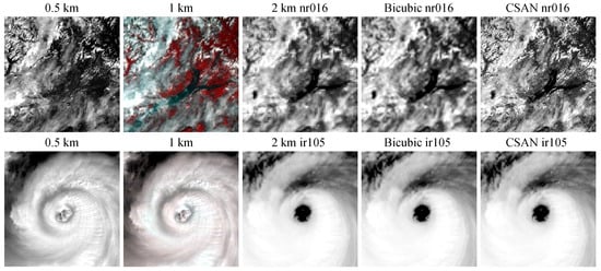 For the SR, we select two representative 2 km bands, nr016 and ir105, to evaluate the model’s performance across different spectral characteristics, as illustrated in Figure 8. In the nr016 band, CSAN significantly improves spatial clarity, producing sharper cloud contours and enhanced land features, with visual quality comparable to the 0.5 km vi006 reference. In the ir105 band, CSAN also enhances resolution and reveals typhoon structures more clearly than Bicubic. However, under complex atmospheric conditions (e.g., cyclone regions), minor structural distortions such as irregularities near the cyclone eye can still occur. These issues are likely caused by the inherent properties of infrared bands, including smoother textures, lower spatial frequencies, and reduced signal-to-noise ratios, which make high-scale SR reconstruction more difficult. Despite these challenges, CSAN consistently outperforms Bicubic across both visible and infrared domains, demonstrating strong generalization to original images. Future work may explore incorporating physical priors or spatiotemporal correlations to improve performance in difficult infrared conditions.