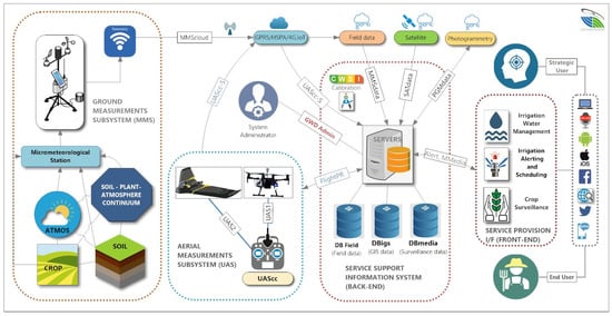 The research presented in this article has formed part of the National R&D Project “GreenWaterDrone” (GWD) [48]. The GWD system functional architecture [26] is depicted in Figure 1, integrating an array of subsystems aimed at optimizing irrigation scheduling and management and providing advanced field monitoring, comprising: (a) ground measurement subsystem (MMS), which includes micrometeorological stations and integrated/peripheral sensors that collect microclimatic and soil profile data. Measurements provided by the MMS are used to calibrate the CWSI calculation for specific crops under local climate conditions; (b) aerial measurements subsystem (UAS) that consists of a UAV RTK platform (quadcopter—UAS1) gathering primary spatial data (leaf temperature, air temperature, and humidity, thermal and multispectral images) and a fixed-wing platform (UAS2) collecting photogrammetry images; (c) back-end information system implementing data management necessary for the storage, classification, processing, and updating of field measurements, empirical irrigation data, spatial and crop quality data, field status multimedia, end-user preferences, and interfaces with external services (satellite imagery, photogrammetry applications). In addition, it interconnects and supports all other subsystems and is responsible for providing system services to all types of end-users; and (d) front-end service provision interface providing web interfaces to different end-users, such as basic users (farmers/agronomists), groups of users (companies/cooperatives), and strategic users (local/regional authorities)] via appropriate graphical user interfaces (GUI).