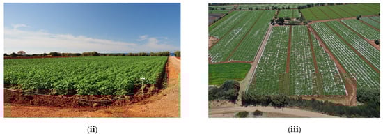 The experimental area was located in the prefecture of Messinia (southwestern Peloponnese), near the city of Kyparissia in the municipality of Trifilia (Figure 2i). The experiment was conducted in two fields: one for potato (Solanum tuberosum; 1.25 ha; 37.222499°N, 21.611512°E) and another for watermelon (Citrullus vulgaris; 0.7 ha), both of which are representative of the area’s cultivations during the 2019–2020 growing season. The potato (Figure 2ii) and watermelon (Figure 2iii) crops were selected based on their relatively high irrigation requirements, which peak in the hot and dry summer period, and the critical susceptibility of potato and watermelon plants to water stress, such susceptibility attributed mainly to their relatively shallow root systems [49]. The fields had a small slope of 0–3% and a clay loam surface soil layer (0–20 cm depth), which transitioned to a sandy clay loam further down (20–60 cm depth). The soil types of the two fields, due to their small size, were determined using a well-distributed sampling method with low variability. Field 1 had a uniform sandy–clay–loam soil type, and Field 2 had an undeviating clay–loam soil type.