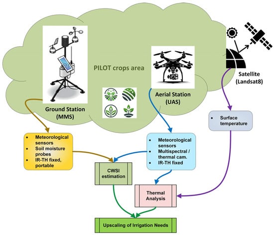 Precision irrigation plays a crucial role in managing crop production in a sustainable and environmentally friendly manner. This study builds on the results of the GreenWaterDrone project, aiming to estimate, in real time, the actual water requirements of crop fields using the crop water stress index, integrating infrared canopy temperature, air temperature, relative humidity, and thermal and near-infrared imagery. To achieve this, a state-of-the-art aerial micrometeorological station (AMMS), equipped with an infrared thermal sensor, temperature–humidity sensor, and advanced multispectral and thermal cameras is mounted on an unmanned aerial system (UAS), thus minimizing crop field intervention and permanently installed equipment maintenance. Additionally, data from satellite systems and ground micrometeorological stations (GMMS) are integrated to enhance and upscale system results from the local field to the regional level. The research was conducted over two years of pilot testing in the municipality of Trifilia (Peloponnese, Greece) on pilot potato and watermelon crops, which are primary cultivations in the region. Results revealed that empirical irrigation applied to the rhizosphere significantly exceeded crop water needs, with over-irrigation exceeding by 390% the maximum requirement in the case of potato. Furthermore, correlations between high-resolution remote and proximal sensors were strong, while associations with coarser Landsat 8 satellite data, to upscale the local pilot field experimental results, were moderate. By applying a comprehensive model for upscaling pilot field results, to the overall Trifilia region, project findings proved adequate for supporting sustainable irrigation planning through simulation scenarios. The results of this study, in the context of the overall services introduced by the project, provide valuable insights for farmers, agricultural scientists, and local/regional authorities and stakeholders, facilitating improved regional water management and sustainable agricultural policies.