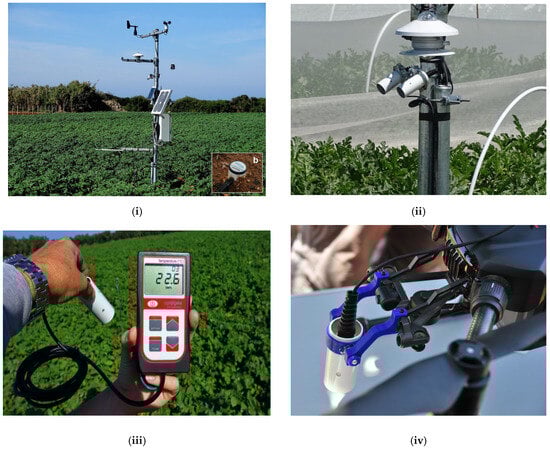 (i,ii) The micrometeorological station installed in the middle of each experimental field and the soil moisture measurements acquired using the HFP01 Hukseflux heat flux plate probe; (iii,iv) the IR-TH radiometer used on the micrometeorological station, as a portable field instrument, and mounted on the drone, respectively.
