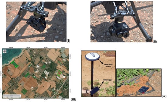 (i) Sentera and (ii) Zenmuse XT2 cameras; (iii,iv) the RTK GNSS used for the collection of the GCPs (green points), their distribution in the two fields, and the aluminum plates used for ground control points, respectively.
