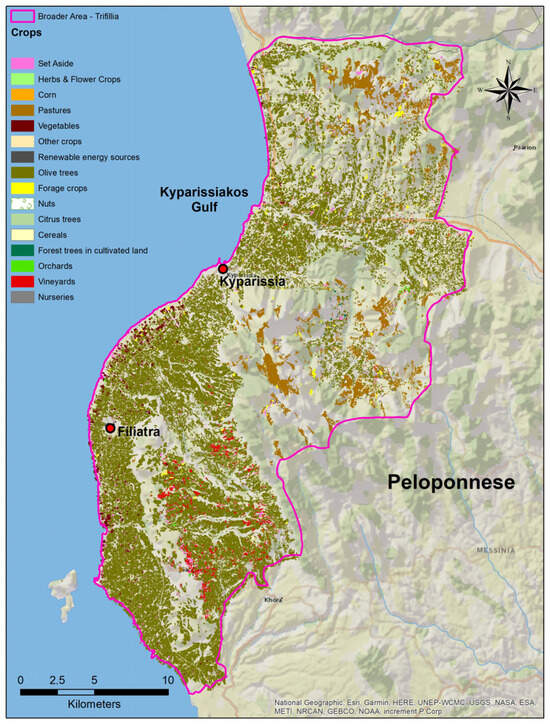 Distribution of crops in Trifilia based on the 2018 Land and Parcel Identification System data, which are an integral part of the CAP’s Integrated Administration and Control System (IACS) and are provided by the Payment and Control Agency for Guidance and Guarantee Community Aid.