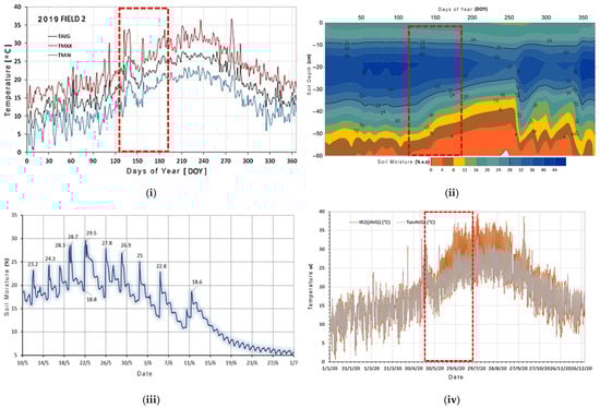 (i) Variation of monthly temperatures (), (), and () for the experimental potato Field 2; (ii) distribution of soil moisture (% w/w) in the soil moisture profile throughout the year 2020 in Field 2; (iii) variation of soil moisture (%) in the 0–10 cm surface layer in a potato crop for the last ten irrigation events, as well as the daily losses of the surface layer (May, June 2019, DOY: 130–181); (iv) hourly canopy temperature data captured by the infrared radiometers [the red boxes delineate the crop growing season].