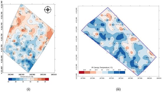 (i) Spatial distribution of foliar temperature values obtained from IR sensor measurements in the watermelon crop; (ii) spatial distribution of foliar temperature values obtained from IR sensor measurements in the potato crop.