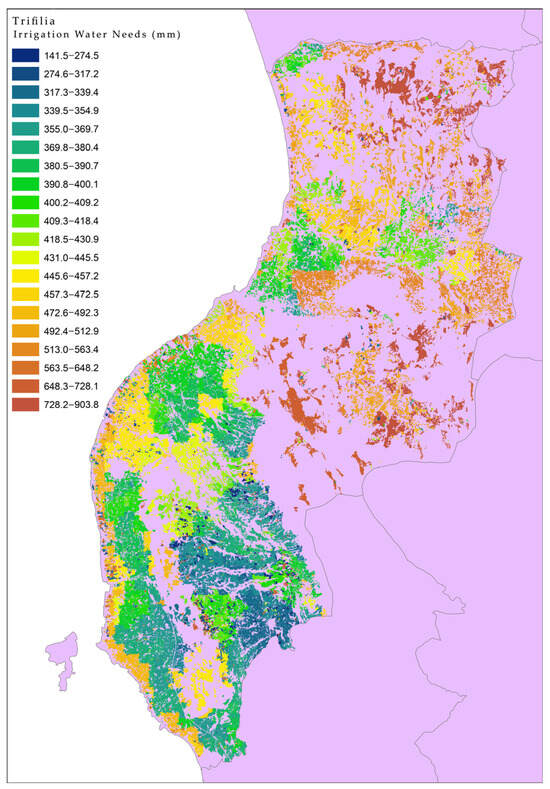 Scaling of the results through the calculation of water needs (in mm), based on the distribution of crops and the use of thermal images in Trifilia (the blue and green shades have lower water needs, while the yellow, orange, and red shades have higher water needs).