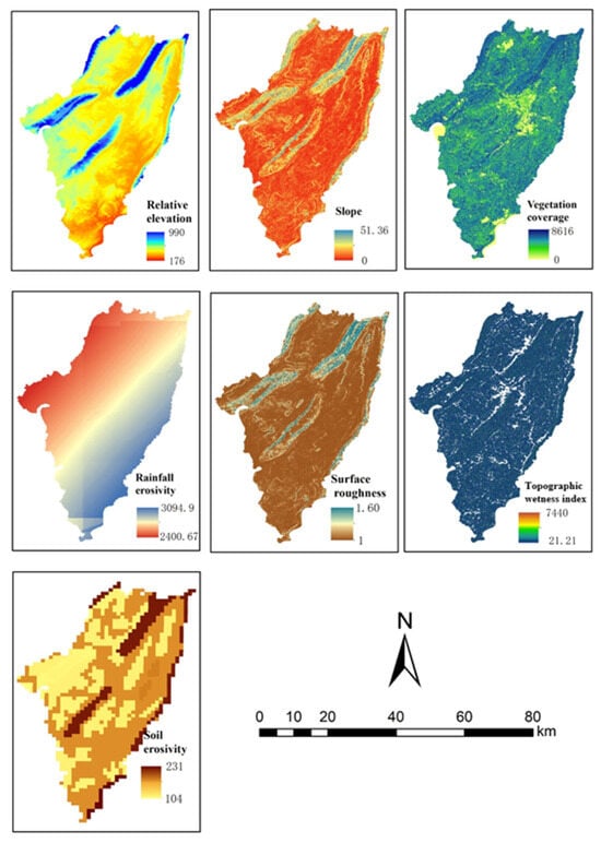 | Soil erosivity (0.06) | Surface roughness (0.13) | Surface roughness (0.13) | Topographic relief amplitude (0.1) | Topographical factor (0.028) | Rainfall erosivity (0.12) | |