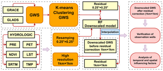 The research proposes a DTW time series clustering-based GRACE groundwater storage downscaling framework to reduce the impact of internal spatial heterogeneity on GRACE groundwater storage prediction accuracy. As shown in Figure 2, the workflow includes the following: (1) applying a DTW-based K-means clustering algorithm to classify groundwater storage patterns; (2) integrating high-resolution remote sensing data with the RF-based downscaling model to downscale the clustered GRACE groundwater storage data, enhancing the data’s spatial resolution from 0.25° to 1 km; (3) validating the downscaled GRACE groundwater storage data using groundwater monitoring well data; and (4) conducting driving factor analysis on the downscaled groundwater storage data using a ridge regression model to identify the key environmental factors influencing groundwater storage changes.